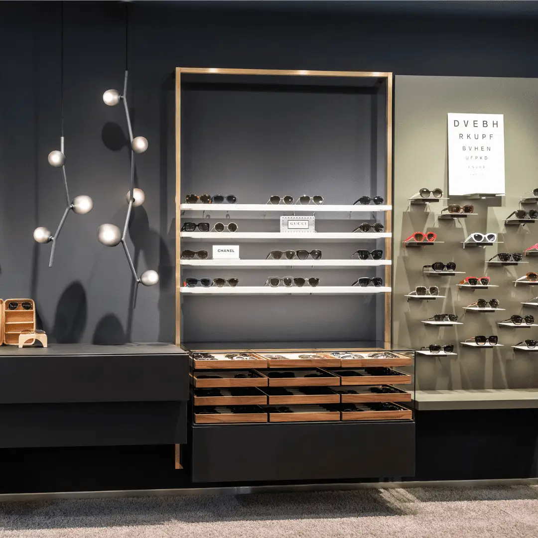 Einführung einer modernen, stilvollen Sonnenbrillenwand, die unseren Showroom bereichert.