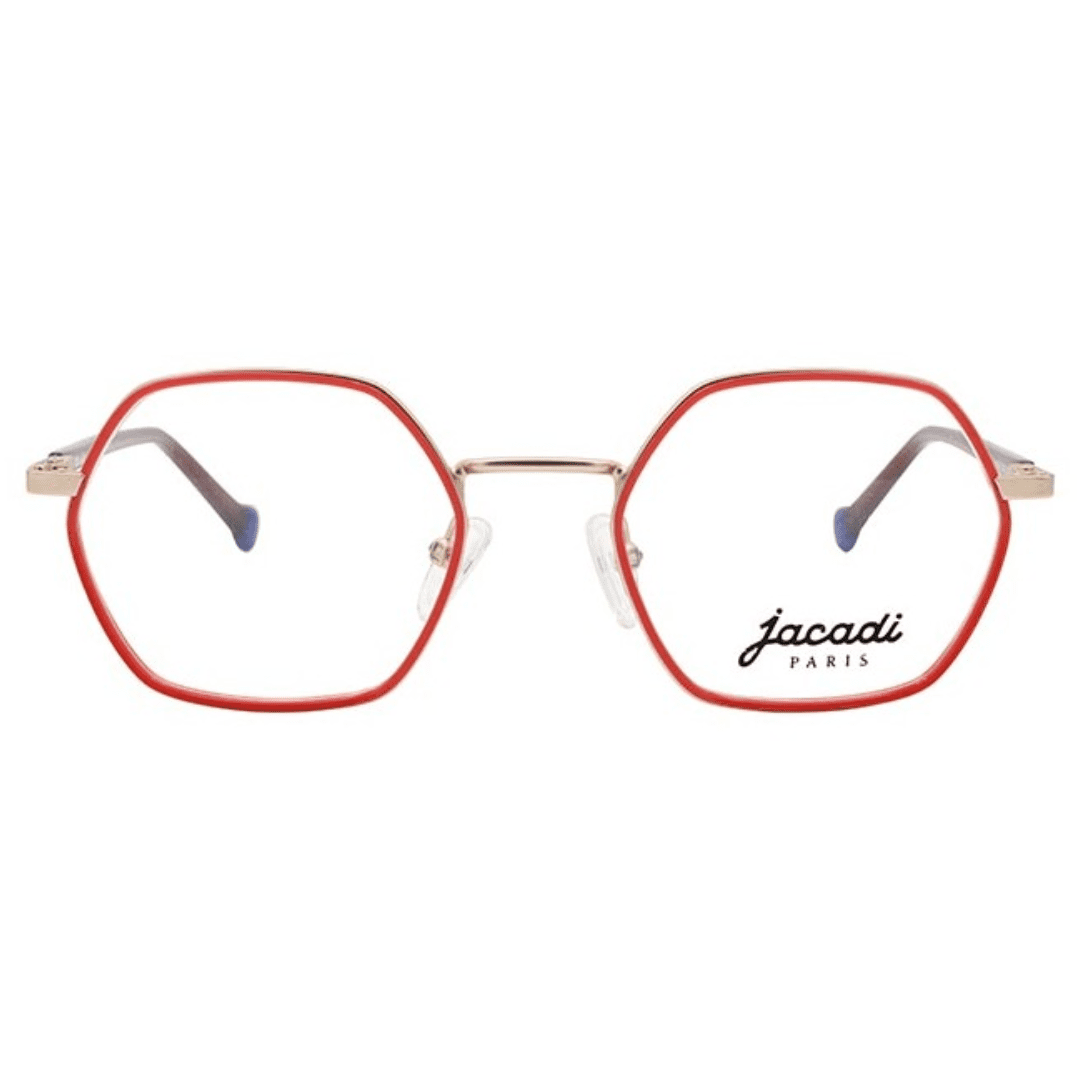 Rote Jacadi Kinderbrille auf weißem Hintergrund.